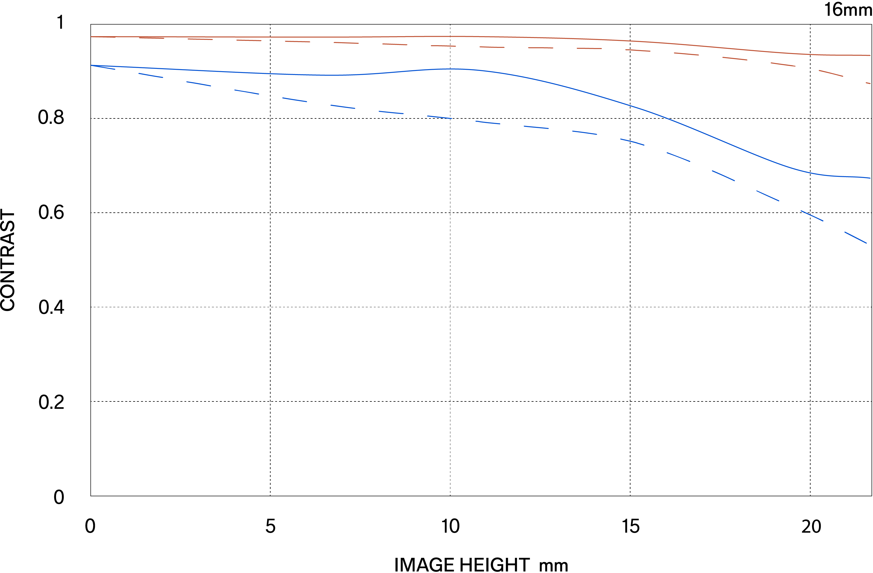 The MTF (Modulation Transfer Function) is one of the measurements for evaluating a lens’ performance, and it shows how faithfully the contrast of the subject can be reproduced on the image plane. The horizontal axis shows the image height (distance from the center of the image in mm) and the vertical axis shows the contrast value (maximum value is 1).